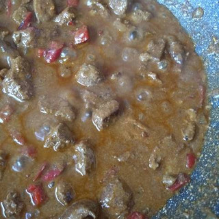 9. Dejar que evapore el alcohol. Y que la maizena se cocine con los jugos. Hasta lograr unos higaditos con una salsa untuosa, consistente. Y muy sabrosa. Concentrada fuerte y picante. Ya que la pasta solo cocida con sal amenguara la diferencia de sabores